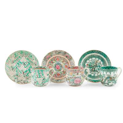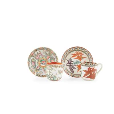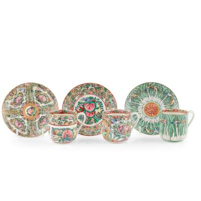 COLLECTION OF FAMILLE ROSE CUPS AND SAUCERS