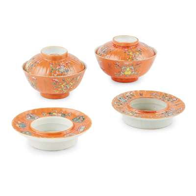 each potted in three parts, saucer, bowl cup, and lid, all exterior enamelled with four of the 'Covert Eight Immortals' motifs intermittent with gilded Shou- longevity reserved on a coral red ground, 'Yuan Zhang Hong Zao' inscribed on a lid and base of bowl, a Qianlong reign mark to another lid and base of bowl