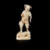 walking across a log, with a rifle placed over his shoulder, shells around his waist and two birds strapped to his belt, signed to the base