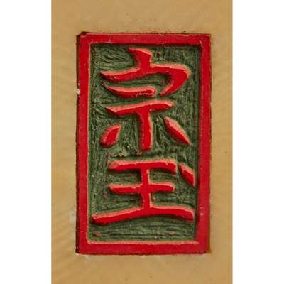 carved on an integral plinth, shown barefoot, wearing a traditional garment and fibre hat slung across his back, striding forward, he holds a net in his right hand and a fish in the left, a basket with long rope handles rests on his forearm, shown tipping slightly to the side with a loose fish falling to the ground, with inked detailing throughout, the base inscribed with 'Sogyoku'