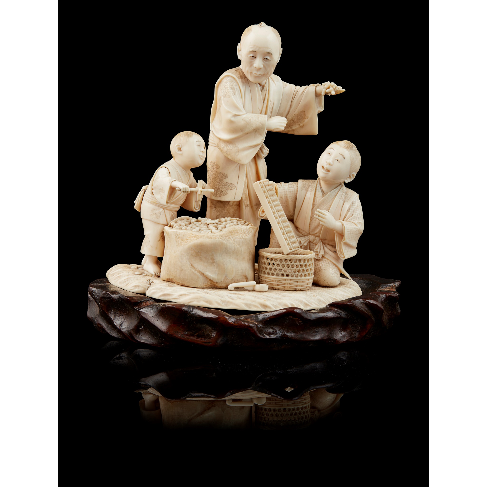 the figures finely carved with a large sack of peanuts in the foreground, the smallest child leans over with a toy in his right hand, the elder child kneels by an empty basket holding an abacus whilst the father stands with peanuts raised in his left hand, with fine incised detailing on the robes, the underside signed 'Munehisa'