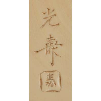 the figure shown in loose fitting over garments tied at the waist, pointing down to the monkey which grabs him by the leg, holding the leash in his left hand and wearing a drum at his hip, a frog partly shielded by leaves sits below, the underside signed 'Mitsutoshi'