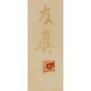 consisting: a standing geisha wearing a kimono, her right hand held up combing an elaborate coiffure, the left clutching a hat by her side, the base bearing the 'Yushin'; another standing geisha, showing holding a bouquet of long stem flowers, with petals strewn at her feet, the base bearing the 'Shoun'