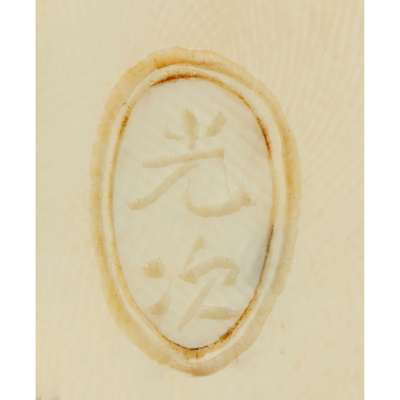 carved standing on an integral plinth, resting his axe on a stump, the base signed ‘Mitsutsugu’