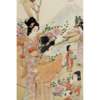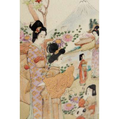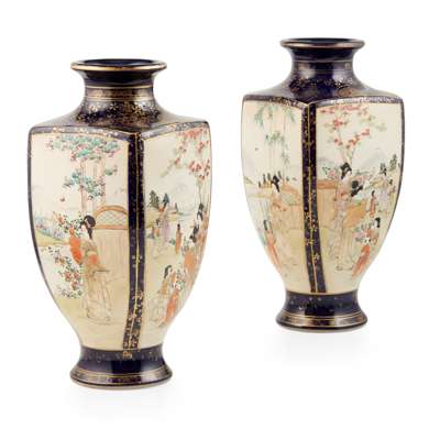 sitting on circular bases, with wide bodies, short necks and flaring rims, with four panels each decorated with scenes of ladies of fashion and children within gardens, the borders and shoulder with a foliate design on a navy ground, the undersides with ‘Kusube’