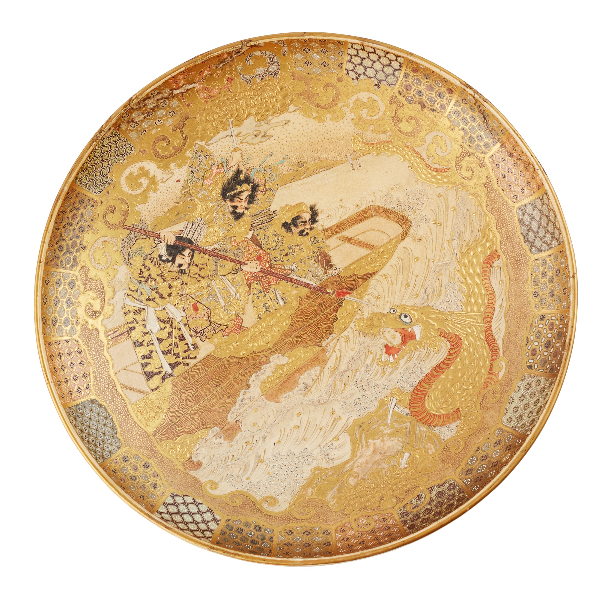 sitting on a ring base with shallow sides, painted in thick gilt, the central scene depicting Susanoo slaying the Yamata no Orochi on an ivory ground, surrounded by a tiled style border