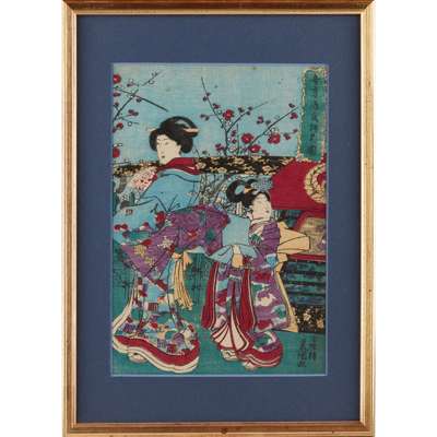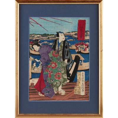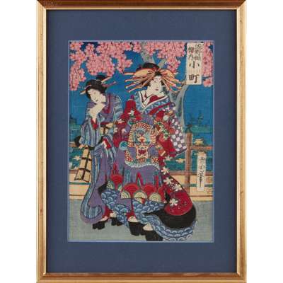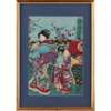 comprising: an Utagawa print depicting two ladies in their kimono with one holding a fan; a print depicting two ladies in kimono under blossoming sakura trees; a print depicting a couple enjoying fireworks from a pier