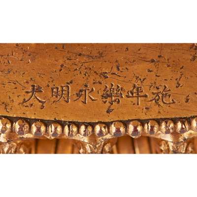 the right arm half raised in vitarka mudra and the left arm lowered in varaha mudra, with two lotus blossoms flanking each shoulder and connected to the outwardly-facing hands by long, curving stems, crowned with an elaborate diadem encircling a high topknot and set above a broad, tranquil face, the ears and body adorned with ornate jewellery, a celestial sash wrapping around the shoulders and arms, the waist sensuously defined above a low-slung dhoti, a six-character Yongle mark inscribed to the front of the base, the bottom of the lotus base incised with a double vajra