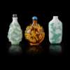 comprising: a green overlay Peking snuff bottle of flattened pear form, decorated with floral foliage around the body, with a spinach jade stopper; a bulbous yellow overlay Peking snuff bottle, adorned with birds on flowering branches, with a lapis lazuli stopper; a green overlay Yangzhou-style snuff bottle of rectangular form, finely carved with flowering branches on rocks and taotie masks attached on the sides