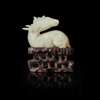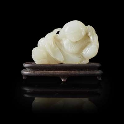 comprising: a recumbent deer turning its head towards the back, carved in detail with a horned head and bulging eyes; and a laughing boy reclining on a pillow, carved in relief with layered robes, each with a wooden base