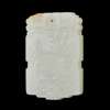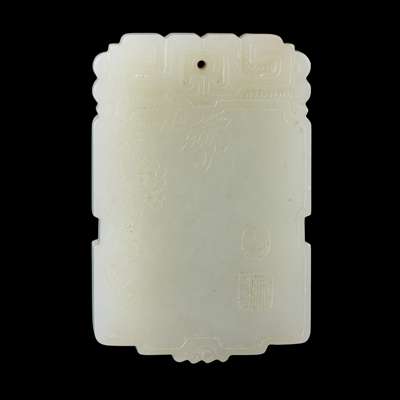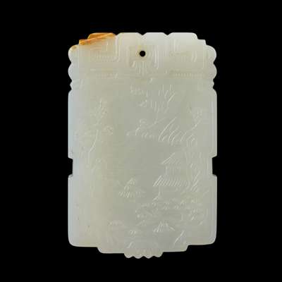 one side carved with a landscape setting with a building surrounded by pine trees on rugged mountains, the reverse side decorated with grape vines and inscribed with two seal marks, all below a key-fret pattern, the stone of an even white colour with one top edge remaining with original yellowish skin