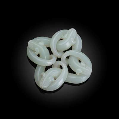carved in openwork with four entwined chi dragons, each bites the sinuous body of the previous one, together forming a well-balanced reticulated pendant, the stone of an even green tone