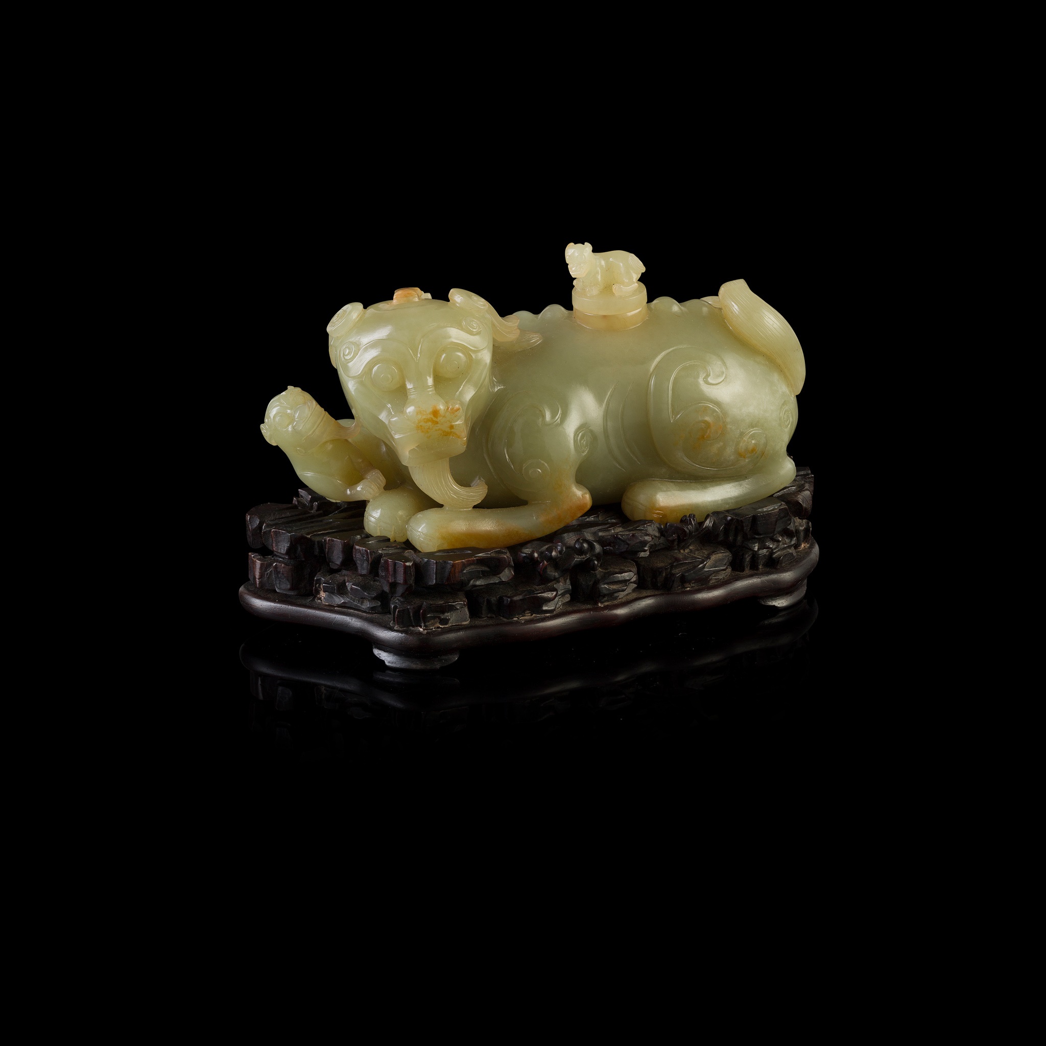 carved in recumbent pose with four legs tucked underneath the body, its head turned towards the left with a cub next to its right leg, centre of its back with a miniature cub on top of the lid as finial, the stone of celadon green colour with various russet patches, with a fitted wooden stand