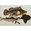 vibrant watercolour paintings on pith, each depicting different fishes, including carp, bream, catfish, flatfish and tropical fish etc.
