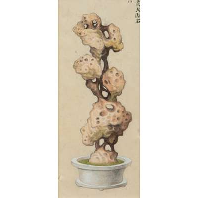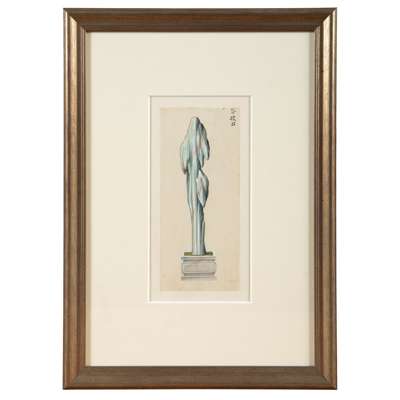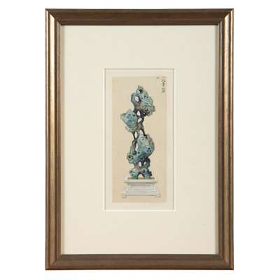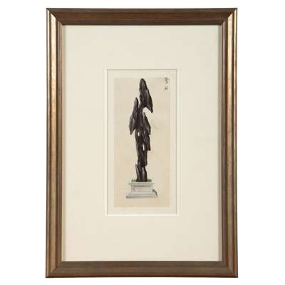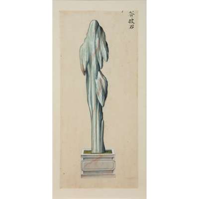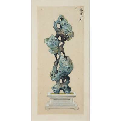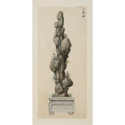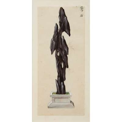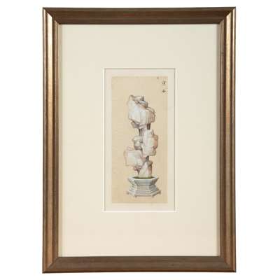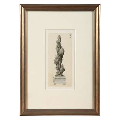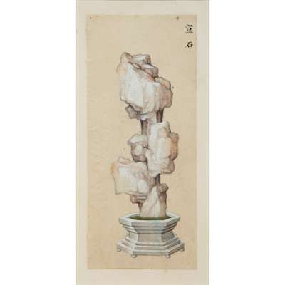 Note: They are part of a massive series of designs sent by Jesuits agents at the Court of Beijing in the 1770 to Henri Bertin, Minister of State for the Bourbon Kings of France and a major collector of things Chinese. There are albums of such drawings, including another set of some of these rocks with Chinese inscriptions describing them (brief titles only).
