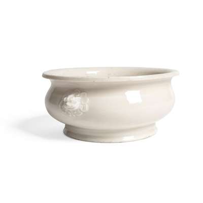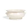 of compressed globular form, rising from a spreading foot to a flared rim, the shoulders attached with a pair of lion-mask handles, the exterior and part of the interior covered in a creamy colour glaze with ivory tinge
