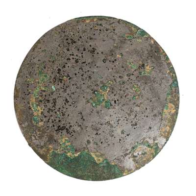 the central knob surrounded by nine raised bosses within a square border, the outer field decorated with 'TLV' pattern, eight bosses, and various mythical creatures within narrow bands enclosing hatched lines, all below a triangular border and a band of twisted pattern