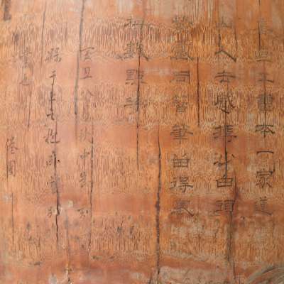Translation of the inscription: "This bamboo, peach blossom and chrysanthemum belong to one (only when the artist sees this kind) of scenery he feels very strong in spirit. Carved in the sitting room by Juan Pu during the mid-autumn festival in 1817"- Jiaqing period (1796-1820)