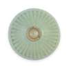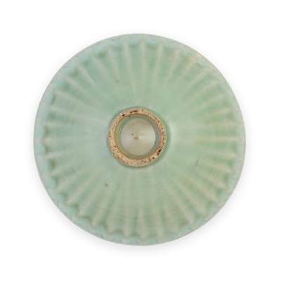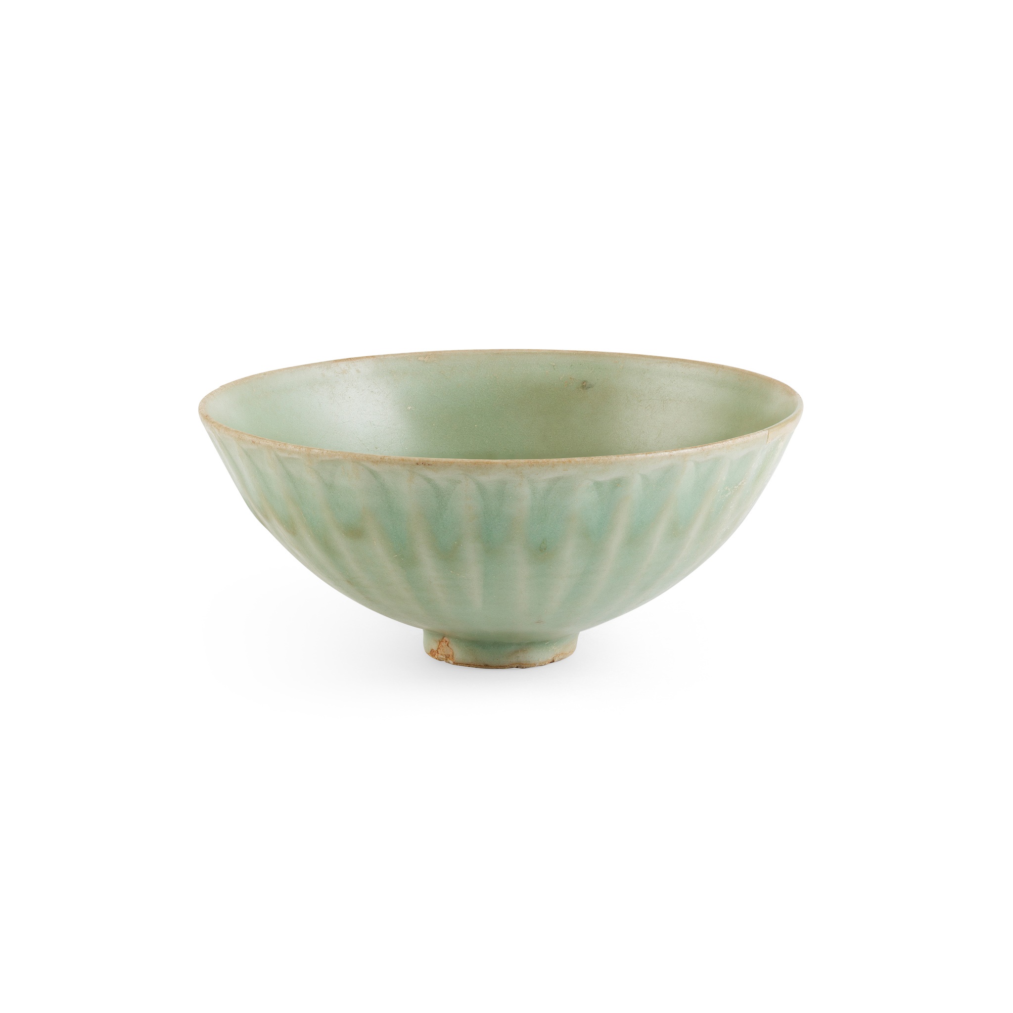 the deep round sides moulded as chrysanthemum petals on the exterior, covered overall in a pale green glaze thinning on the ribs and ending in a line above the edge of the foot, exposing the buff body on the foot rim
