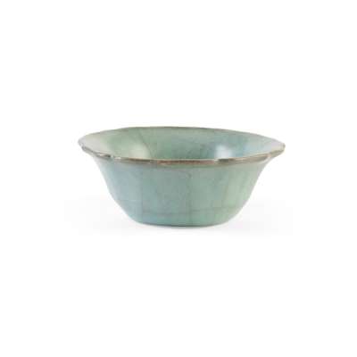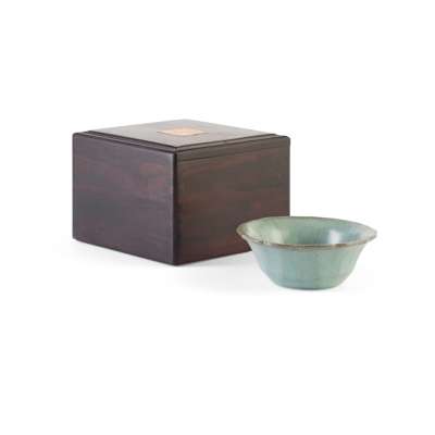 finely potted with shallow round sides, supported on a short foot and terminating to a flaring barbed mouth, covered overall in a crackle glaze with greyish-celadon tone, with a fitted wooden box