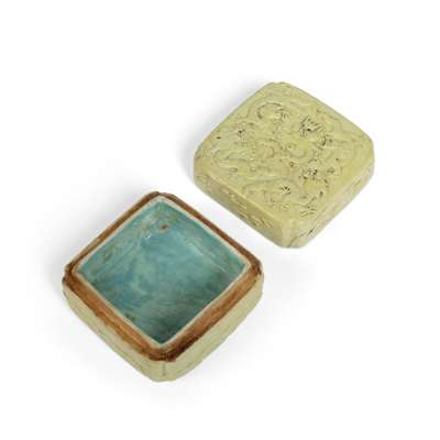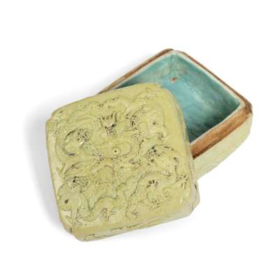 with canted corners, the slightly convex cover carved in relief with five four-clawed dragons chasing a pearl, the sides of the cover decorated with clouds and the sides of the box with swirling waves, the exterior covered in lemon-yellow glaze, the interior in turquoise
