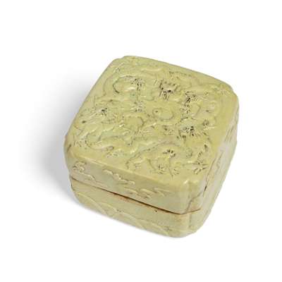 CARVED PORCELAIN LEMON-YELLOW-GLAZED SQUARE BOX WITH COVER