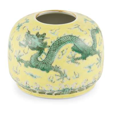 rising from a short foot to a bulbous body, terminating to a gilded inverted rim, the exterior enamelled in green with a pair of sinuous five-clawed dragons chasing flaming pearls above a band of crashing waves, all reserved on a yellow ground, the base inscribed with a six-character Daoguang mark in underglaze blue