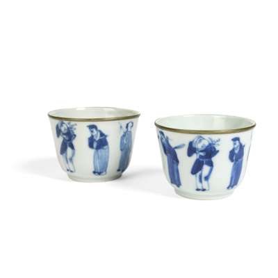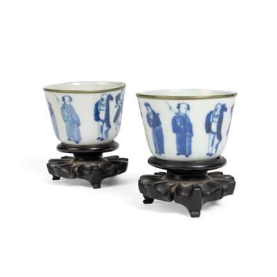 清 蒲堂福記款 青花人物紋杯帶座(兩件)