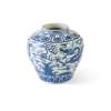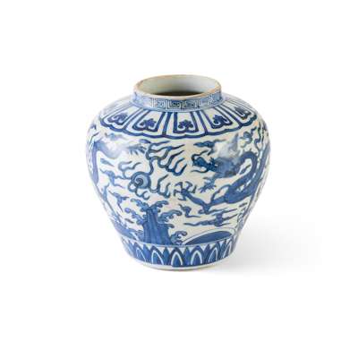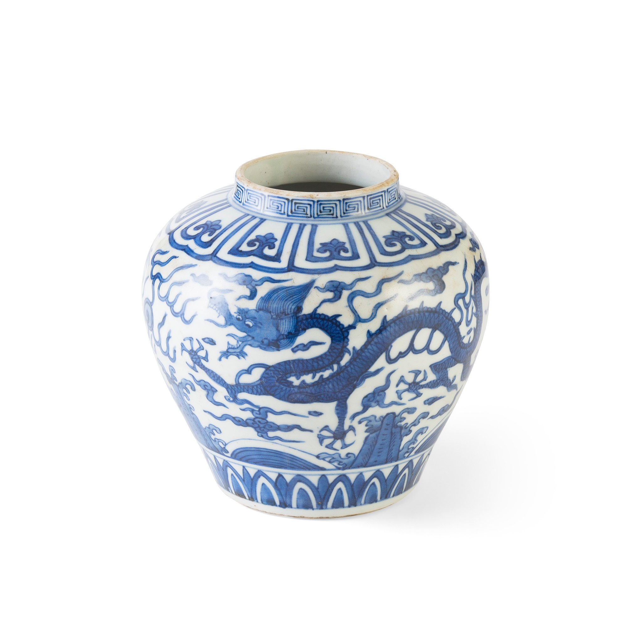 the broad shouldered body terminating to a short straight neck, the body painted with a five-clawed dragon chasing a flaming pearl in clouds, the shoulders and neck adorned with lotus petal and key fret bands, a leafy band to the foot, the base inscribed with a six-character Wanli mark in double circles in underglaze blue