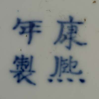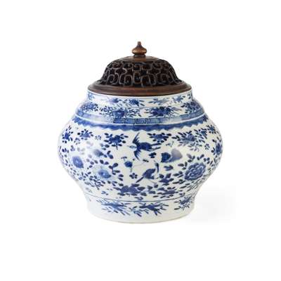 of globular form, the stepped neck rising to a short rim, the body painted with various birds, foliage and key fret bands, the base inscribed with a four-character Kangxi mark, with a wooden cover