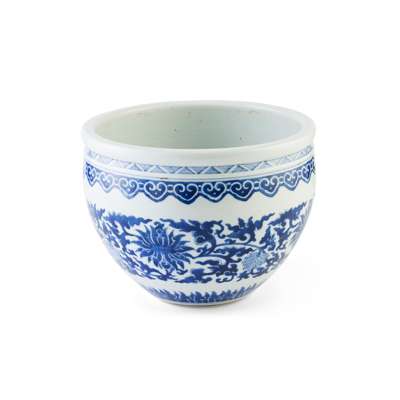 the bulbous body painted with lotus flowers and scrolling foliage, with a leafy band to the foot and ruyi head collar below lipped rim