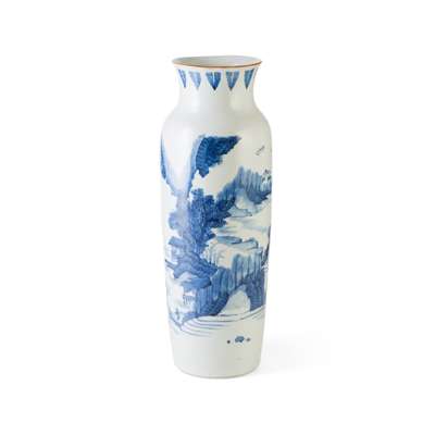 of cylindrical form with a waisted neck and flared rim, the exterior painted with a hermit in a dramatic mountainous landscape setting, a band of plantain leaves adorned the everted rim