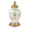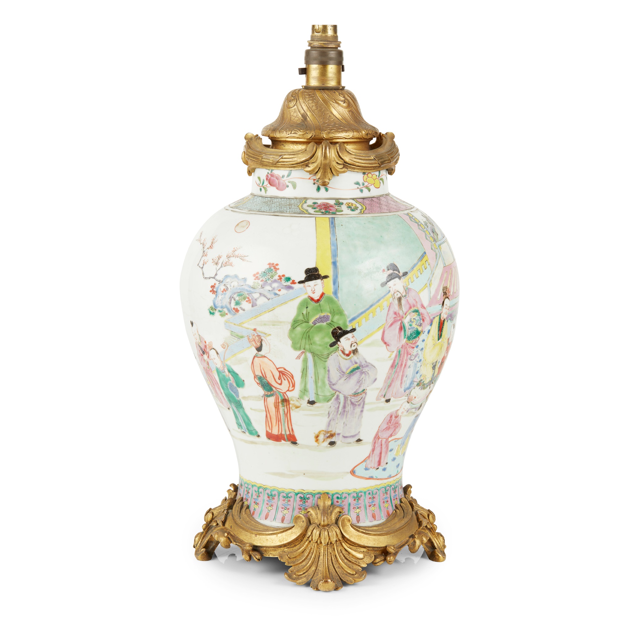 the tapering bulbous body rising from a slightly spreading foot to a straight short neck, the body enamelled with a scene of the birthday reception for General Guo Ziyi, converted to a lamp, fitted on a heavily cast gilt-bronze filigree stand and mounted with lamp appliances