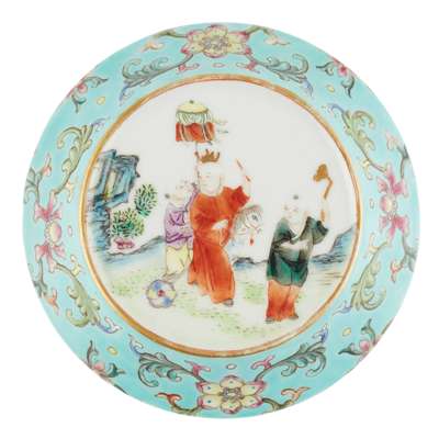 the top of the cover decorated with boys at play, including a boy riding a toy horse in a medallion with gilt circle, the rest of the exterior painted with floral scrolls reserved on a turquoise ground, the base inscribed with a four-character 'Jiu Wan Shan Fan' studio's mark in iron red