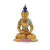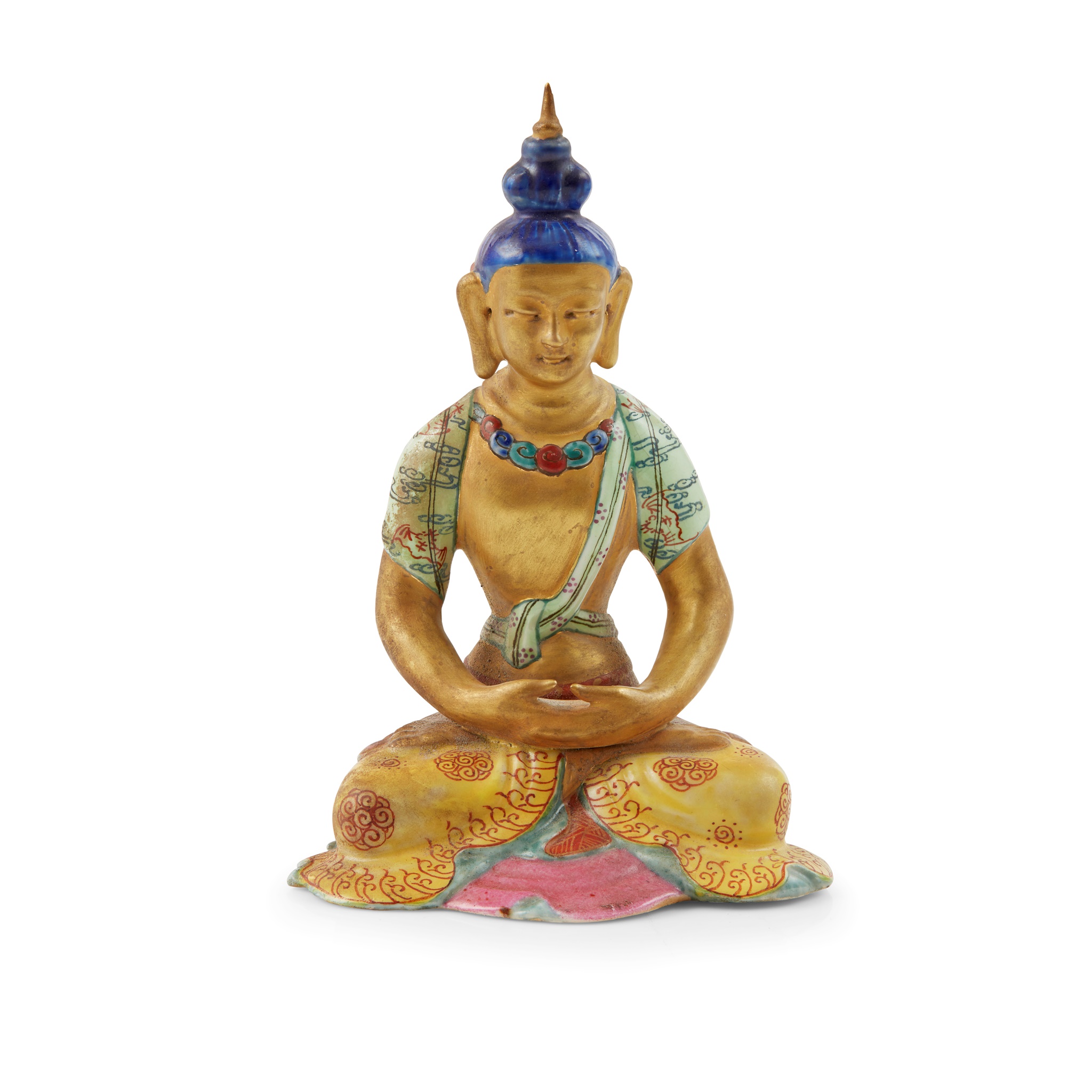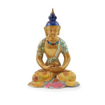 the Buddha wears a yellow-enamelled dhoti draped naturally over his knees, a mint-enamelled crescent-shawl covering his shoulders with ribbons tied loosely against his abdomen, decorated with auspicious clouds and five bats, the body covered with gilding, his hair in blue with high chignon, seated in dhyanasana, hands in dhyana mudra, his eyes downcast in a graceful expression