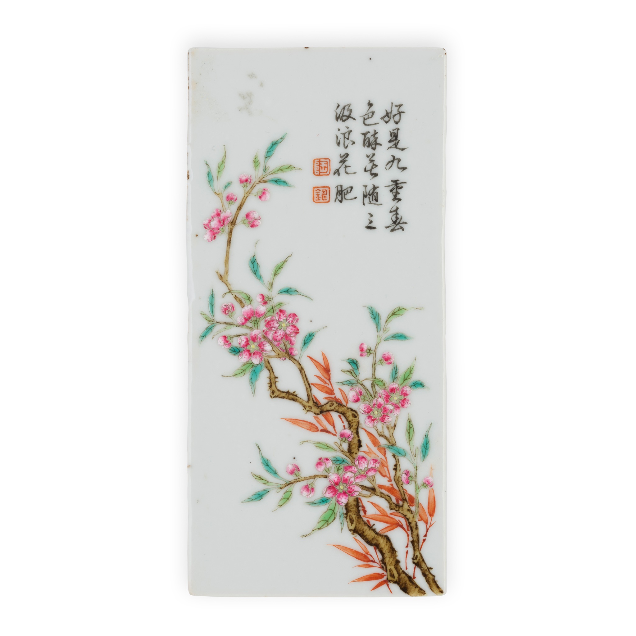 of rectangular form, enamelled with peach blossoms amongst branches and leaves, with poetry to the top right