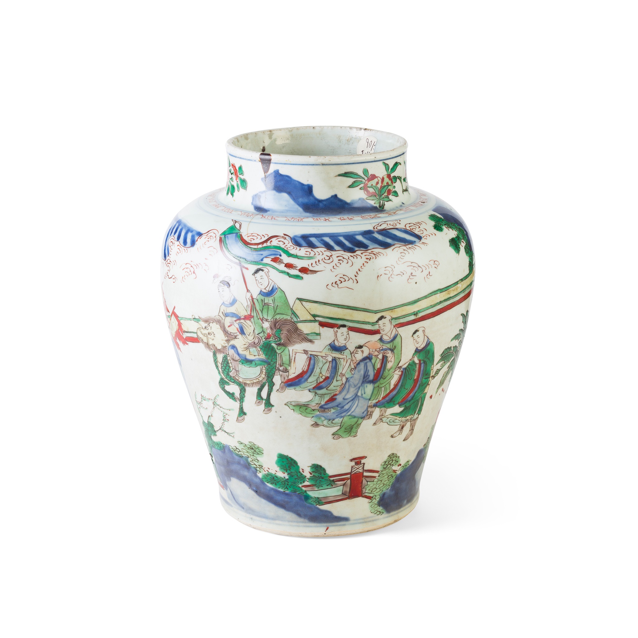 the broad-shouldered body decorated with an officer holding a ruyi sceptre and riding on a mythical beast qilin, followed by attendants with flags walking along a village setting, the straight neck adorned with red flowers on leafy foliage