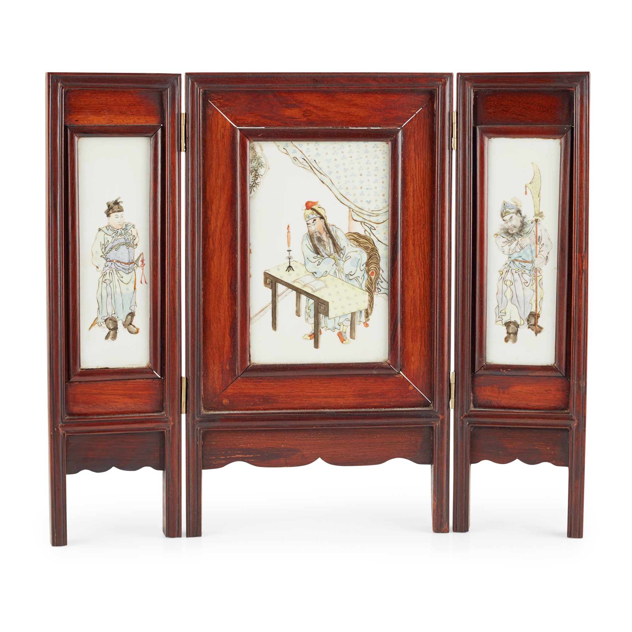 the central panel painted with a long-beard official seated on a tiger-skin covered chair, reading with a flaming candle underneath a pleated curtain, the side panels each painted with a figure facing inward, one with a sword hanging from his waist, the other holding a Guandao weapon, the porcelain panels inset within hardwood frames with two extended legs, both side panels foldable to cover the main part