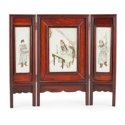 民國 硬木嵌粉彩人物紋瓷板摺曡式桌屏
