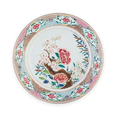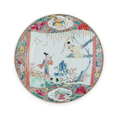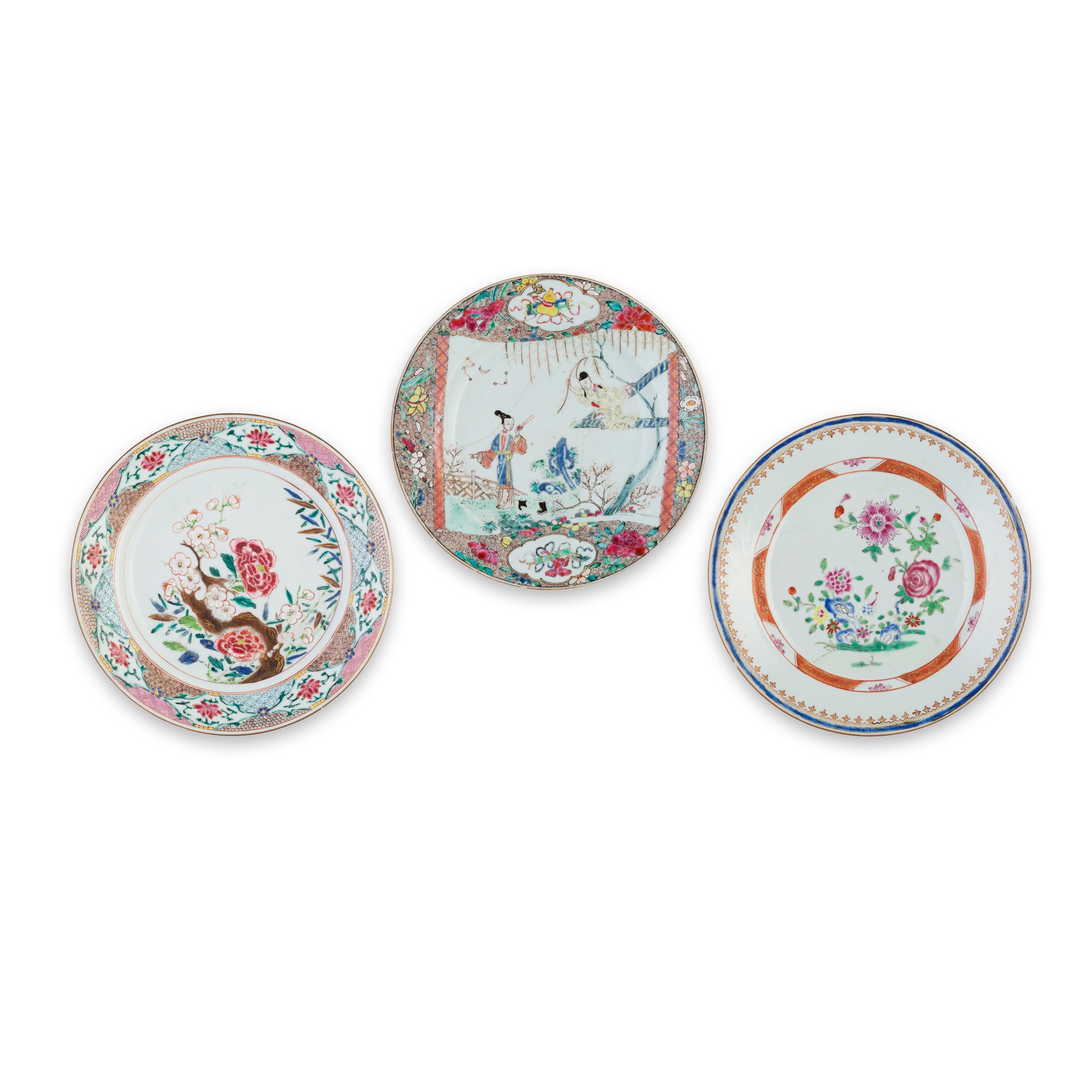comprising: one plate with flowers and stylised rocks decorated in medallion, a band of fleur-de-lis near the rim; one plate with peonies and prunus blossoms in medallion, a band of scrolling lotus in cartouches to the cavetto; and one plate painted with a scene from Romance of the Western Chamber with a male figure climbing over a wall to meet a female figure in a scroll-shaped cartouche