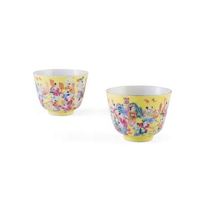 PAIR OF FAMILLE ROSE YELLOW-GROUND 'BOYS AT PLAY' CUPS