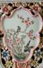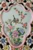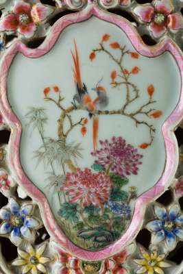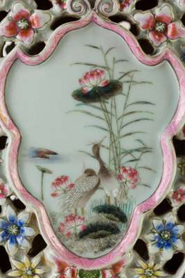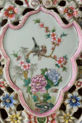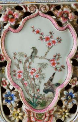 the body decorated with flowers and birds in shield-shaped cartouches surrounded by a flower-head band in openwork, the neck adorned with square panels and flanked by a pair of mythical beasts as handles, inscribed with an apocryphal six-character Guangxu mark in iron red, with a carved wooden stand on different levels