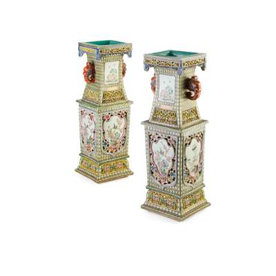 PAIR OF FAMILLE ROSE SQUARE-SECTIONED BALUSTER VASES