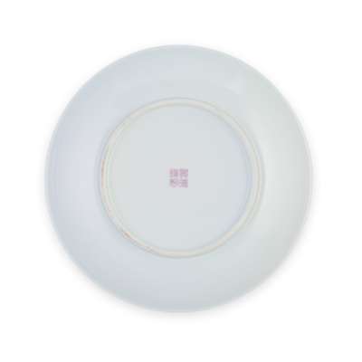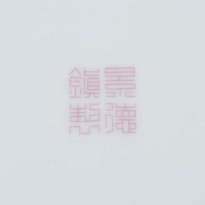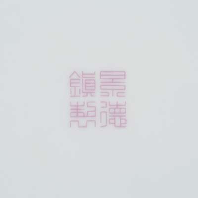 in mirrored design, each painted with small sampan with boatman and passenger sailing on the river in a mountainous landscape, one plate signed 'Cheng Yi', the base bears a four-character 'Jing De Zhen Zhi' mark in red