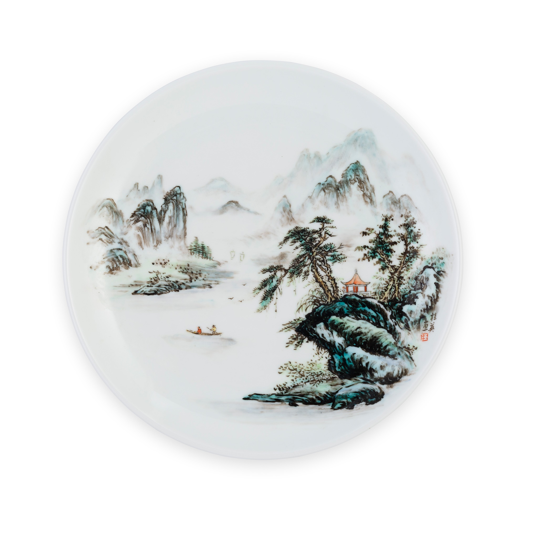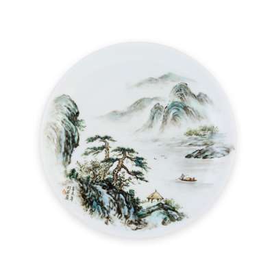 景德鎮底款 程英書款 淺絳彩山水人物紋盤(兩件)