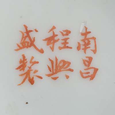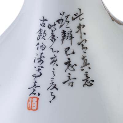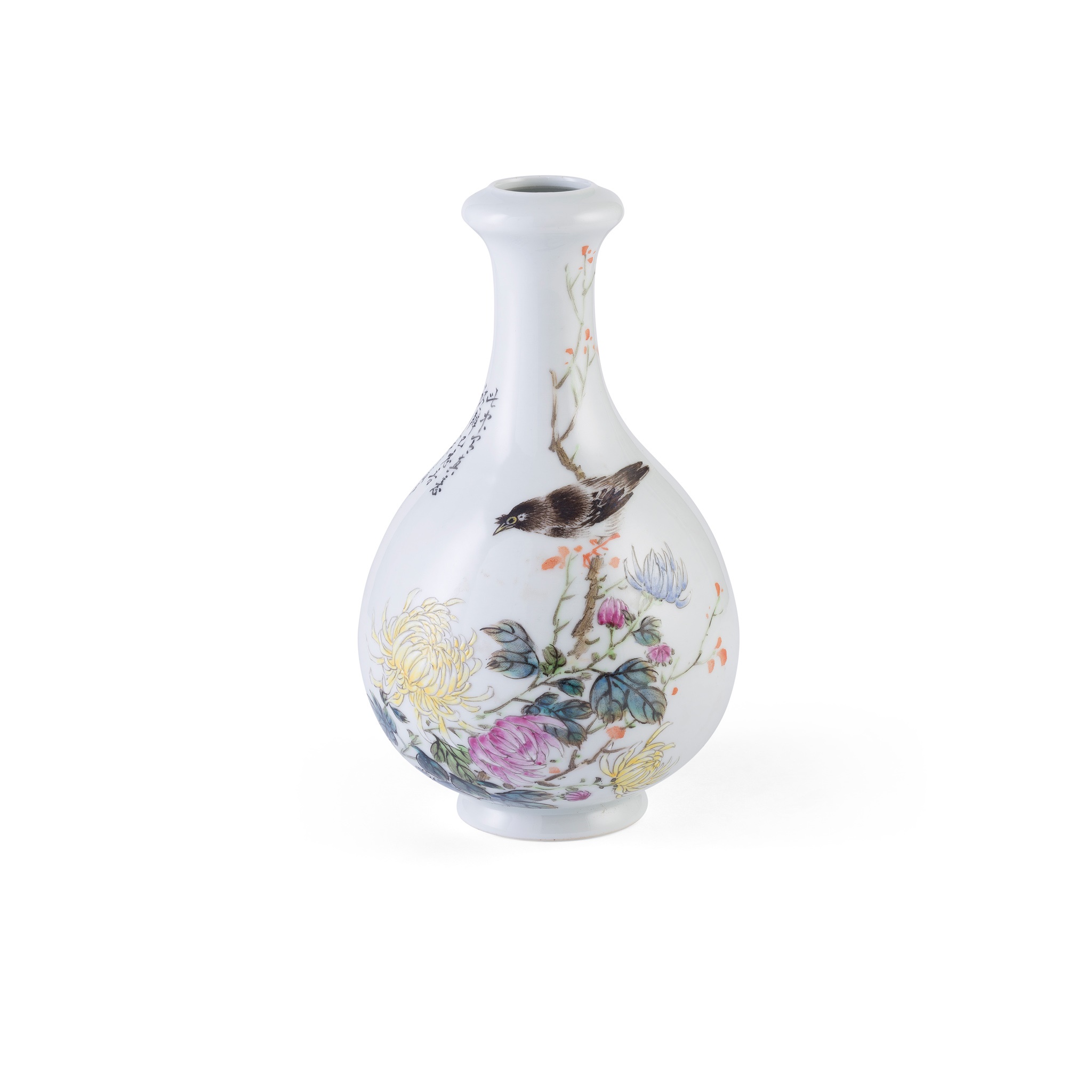 the bulbous body supported on a short foot, the neck extended to a disc-like mouth and terminating to an inverted rim, the sides painted with a bird perching on tree branches with blossoming chrysanthemums, inscribed with a poetry, signed 'Bo Tao', the base inscribed with a six-character 'Nan Chang Cheng Xing Cheng Zhuang' workshop's mark in iron red
