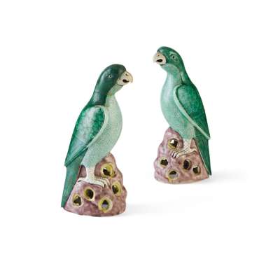 in mirrored position, each modelled perching on an aubergine- and yellow-glazed rocky base in openwork, the bird enamelled with different shades of green with creamy yellow beak, outlined in black for feathers in various textures