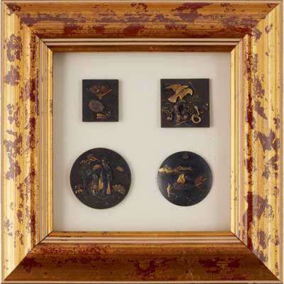 comprising: one circular bronze roundel inlaid with gold and copper depicting a mother and child walking together through a garden, with toadstools and foliage in the background; one square medallion inlaid with gold and copper depicting a fan and mirror; one circular bronze roundel inlaid with gold and copper depicting a frog pulling a rickshaw with a smaller amphibian running behind, with hills in the background, possibly referencing a Kawanabe Kyōsai work; one square medallion inlaid with gold and copper depicting a kite perched upon a rock with a raised snake below