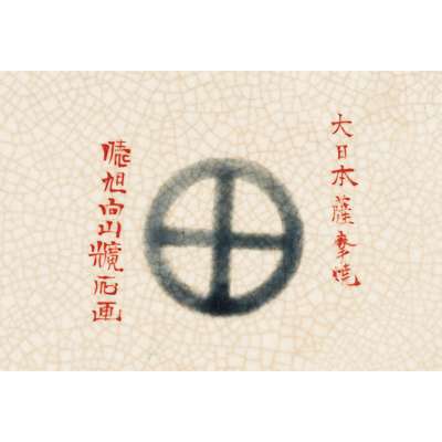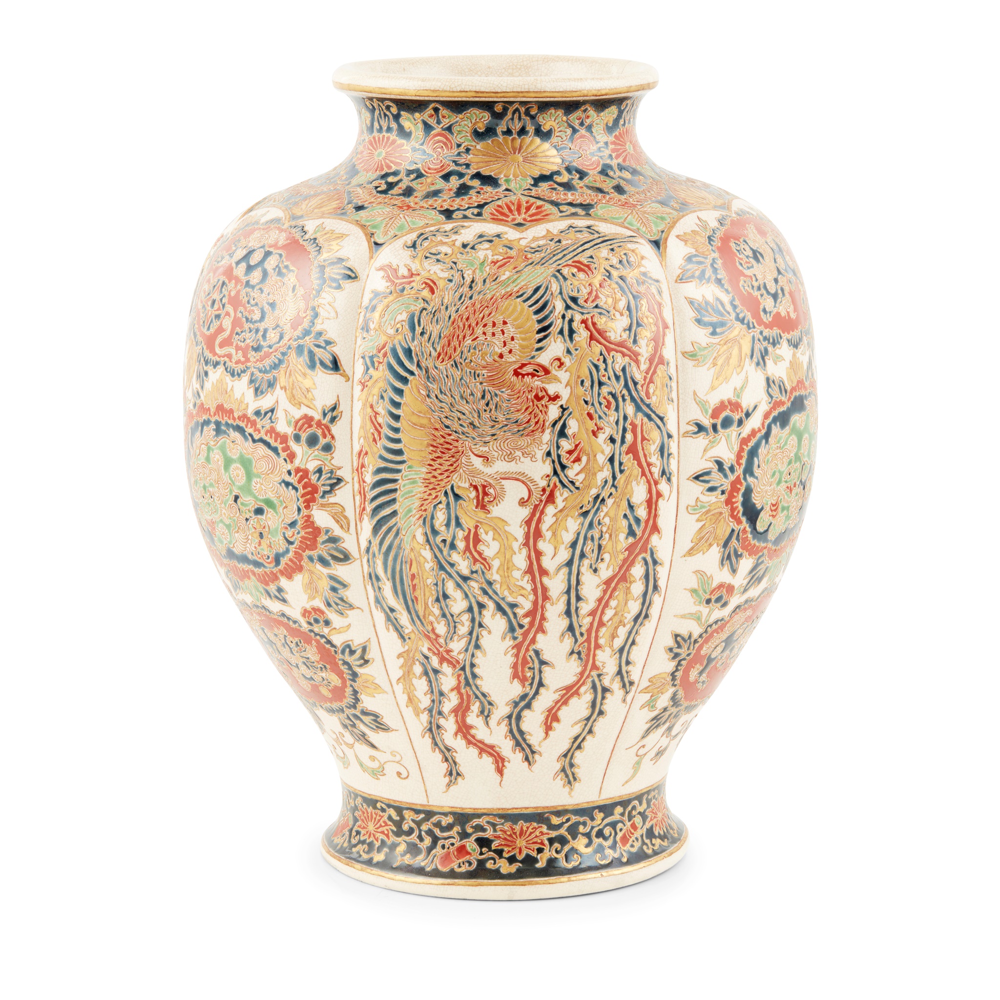 rising from a circular foot, of ovoid form with flared neck, painted in various coloured enamels on a cream field, a series of six panels alternately depicting elaborately plumed phoenix and horizontal medallions containing mythical creatures, the footrim and neck both adorned with flowers and scrolling foliage reserved on a blue ground, the base inscribed with a Shimazu family crest in dark blue and a 'Dai Nippon Satsuma' generic marking to its right and a seven-character maker's mark to the left