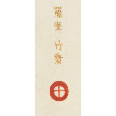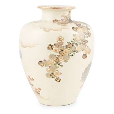 rising from a flat base, with tapering shoulders and flared rim, the body depicting a rich field of peonies, chrysanthemum and camellia amongst ethereal clouds in gilt, the base signed 'Satsuma Chikusai' in gold and a Shimazu family crest in red